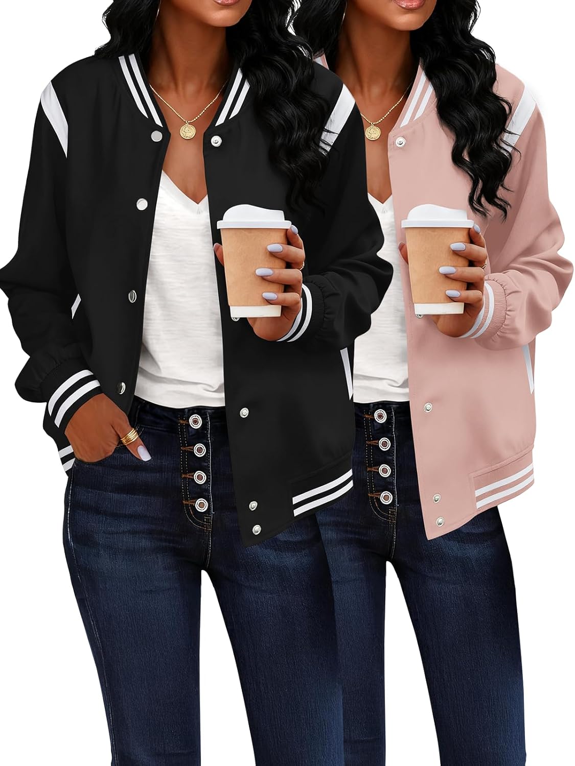 Bomber Jacket Women Varsity Casual Button Down Lightweight Fall Winter Short Outwear with Pockets