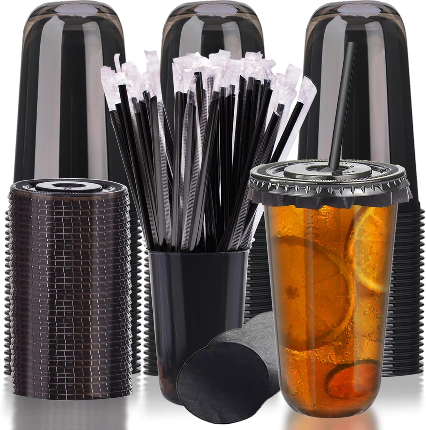 18oz Disposable Stemless Glasses with Flat Lids and Straws,PET Disposable Drinking Cups,Clear Plastic Wine Glasses for Parties Birthday,Wedding,Meeting,Christmas Party Supplies. (50, Black)