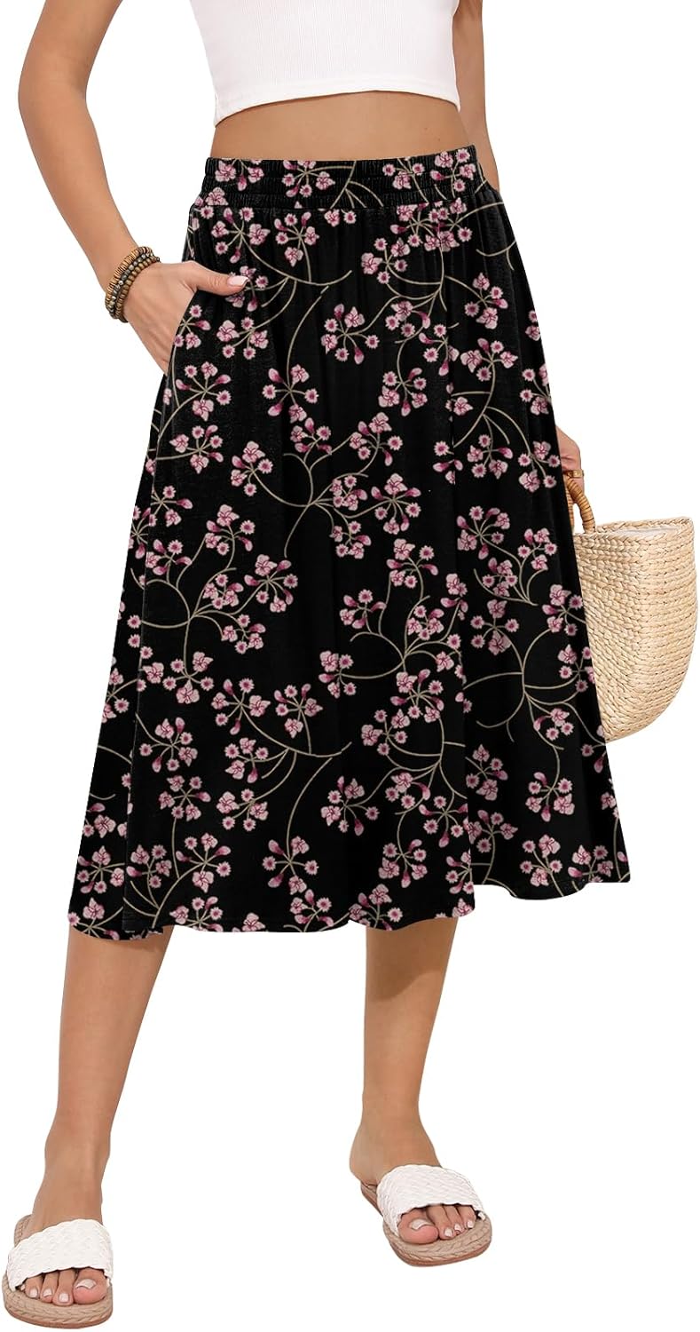 Women's Midi Skirt Summer Flowy Elastic High Waisted Casual Pleated Skirts with Pockets