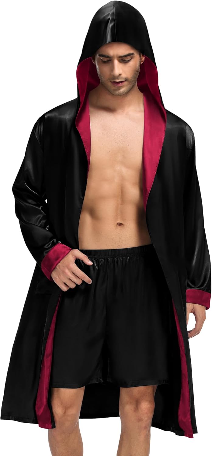 SWOMOG Mens Hooded Robe Satin Bathrobe with Shorts Set Silky Kimono Robe with Hood