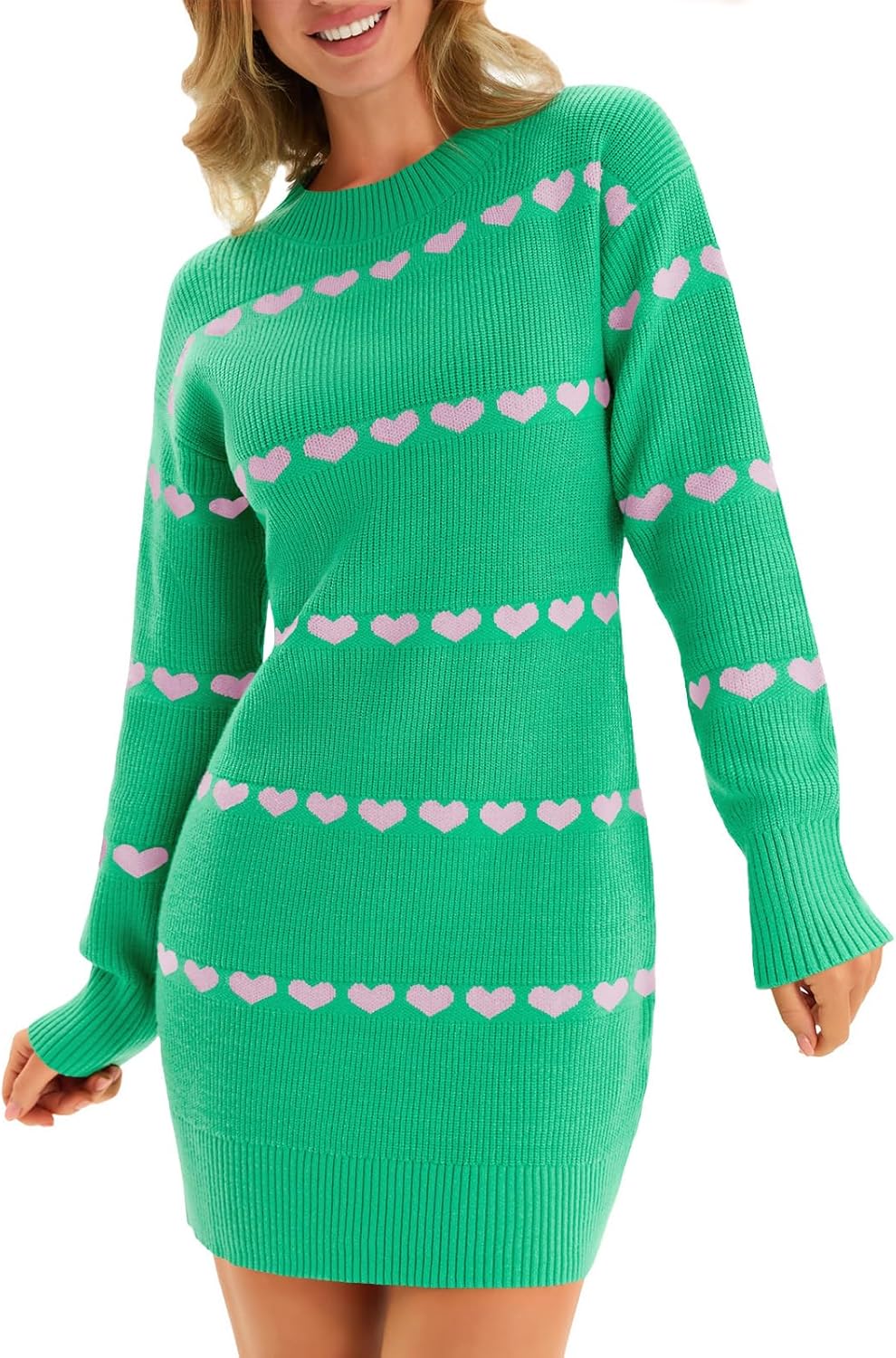 Wenrine Womens Long Sleeve Sweater Dress Fall Knit Heart Crewneck Cute Valentines Bodycon Mini Dresses