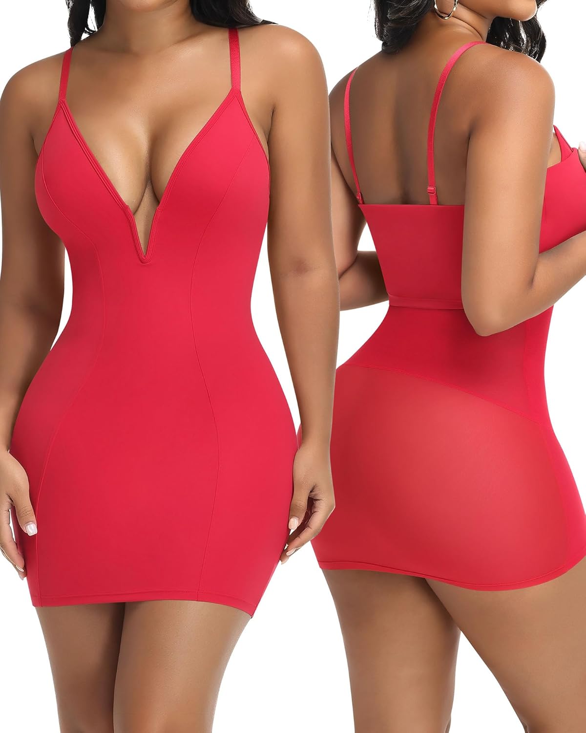 SHAPERIN Women's Deep V Neck Mini Dress Built-in Shapewear Slip Tummy Control Bodycon Night Out Party Short Dresses