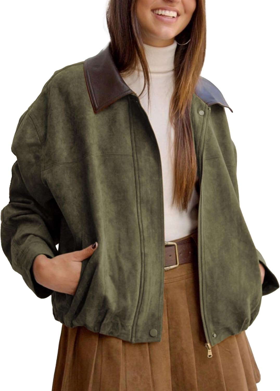 Womens Faux Suede Bomber Jacket Casual Lapel Pilot Cropped Jackets Oversized Motorcycle Zip Up Outerwear Coats
