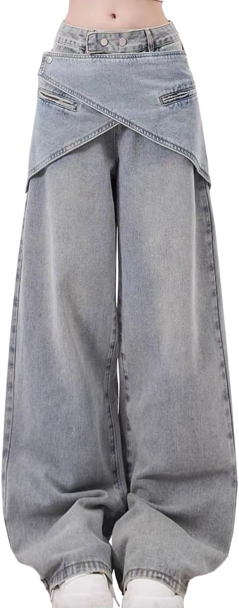 Fashion Casual Straight High Waisted Baggy Jeans Y2K Gradual Waist Skirted Patchwork Wide Leg Denim Pants