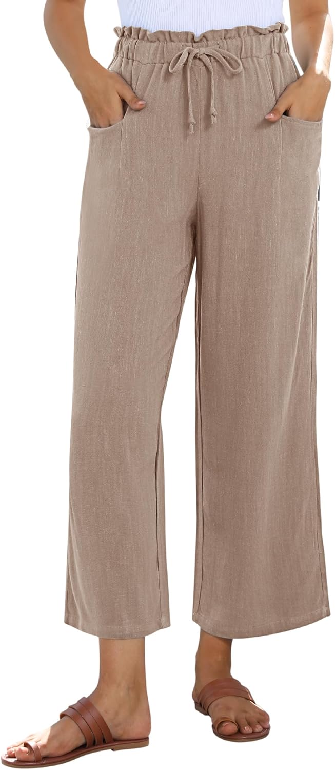 siliteelon Wide Leg Linen Pants for Women Summer Capri Palazzo Flowy Pants Casual Loose High Waist Trousers with Pockets