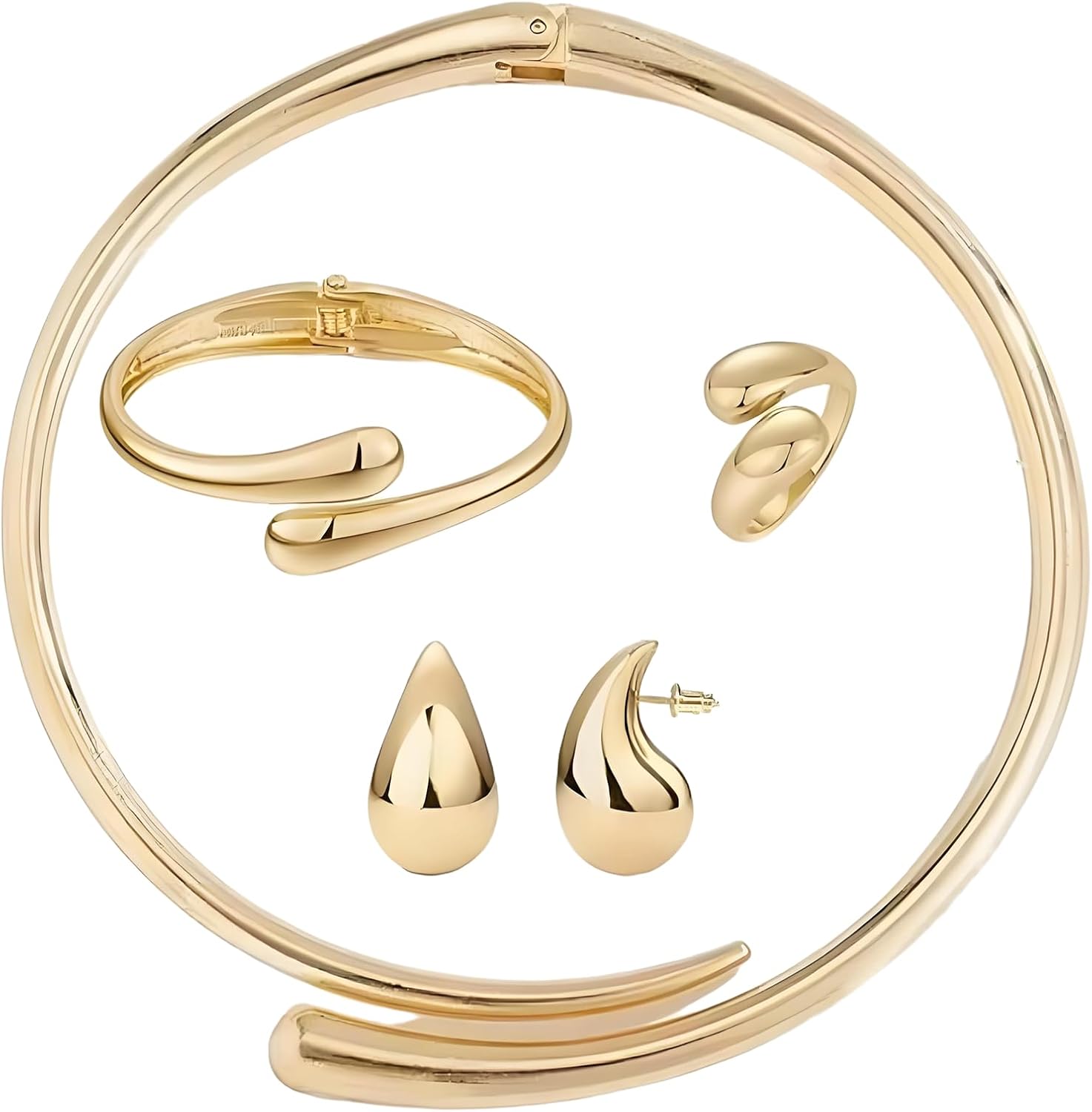 Gold Statement Jewelry Set for Women Teardrop Choker Necklace Trendy Drop Earrings Cuff Bracelet Adjustable Statement Ring Elegant Formal Jewelry Accessories