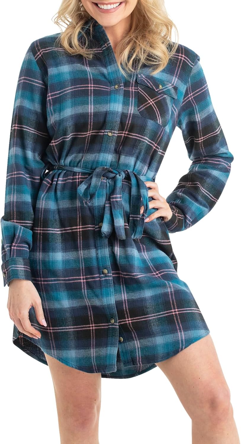 Legendary Whitetails womens Open Spaces Dress, Plaid Flannel Long Sleeve Button Up Tunic With Belt