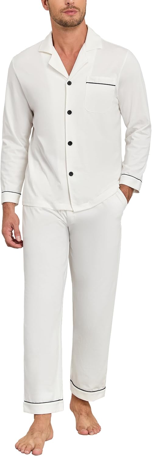 CF Mens Pajamas Set 100% Cotton Sleepwear Button Down Pj Sets Long Sleeve Lounge Set Soft Nightwear with Pockets & Front Fly