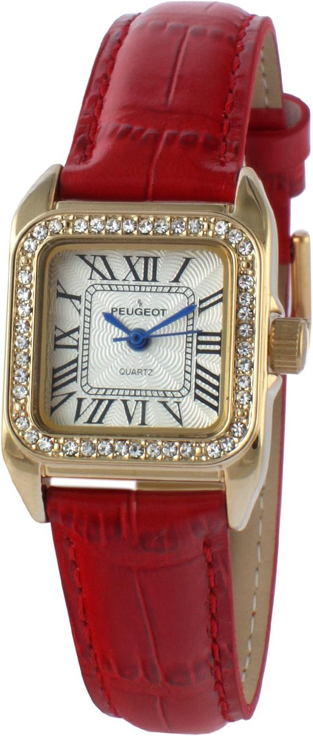 Peugeot Women's 14K Gold-Plated Tank Crystal Bezel Roman Numeral Black Leather Band Watch 3052BK