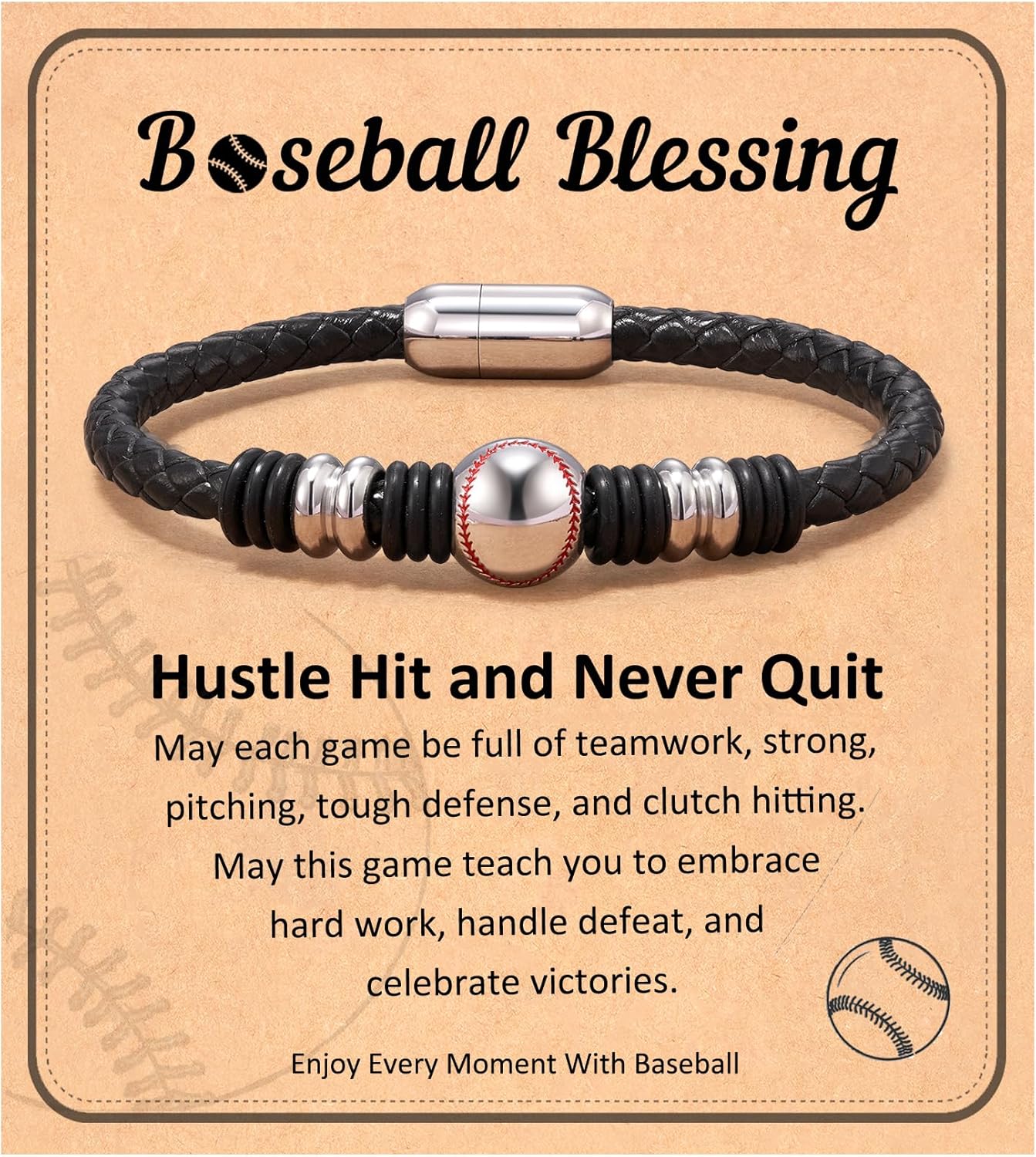HGDEER Baseball Soccer Bracelet, Black Leather Stainless Steel Charm Baseball Soccer Gifts for 8-16 Year Old Teens, Teams, Son, Grandson Brother Ideas
