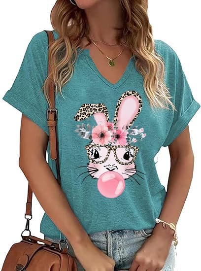 Ovazly Easter V Neck Shirts for Women Happy Easter Bunny with Glasses Blouse Casual Graphic Spring Colorful Tops Tee