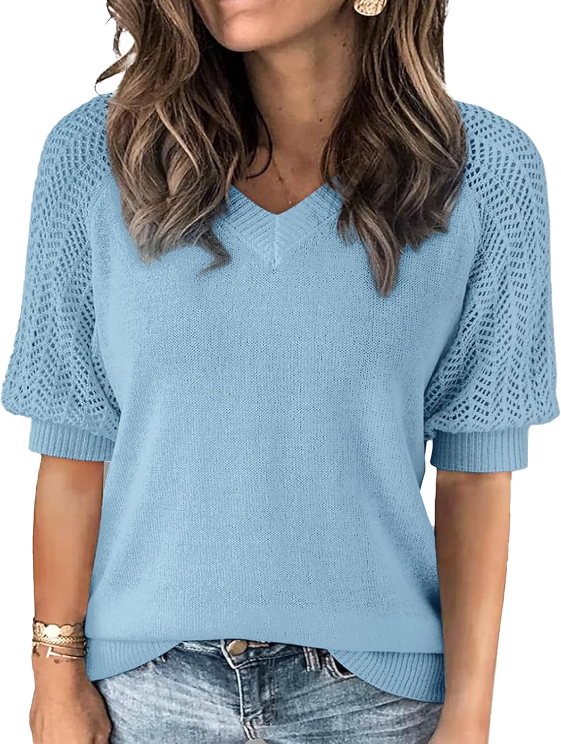 Women Half Sleeve Knitted Sweater, Fall Summer Solid Hollow Crochet Top - V Neck, Elasticity, No Pilling, Lightweight