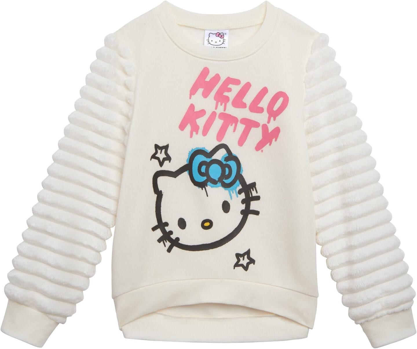 Hello Kitty Girls Fleece Pullover Sweatshirt with Faux Fur Sleeves Toddler to Big Kid Sizes (2T - 14-16)