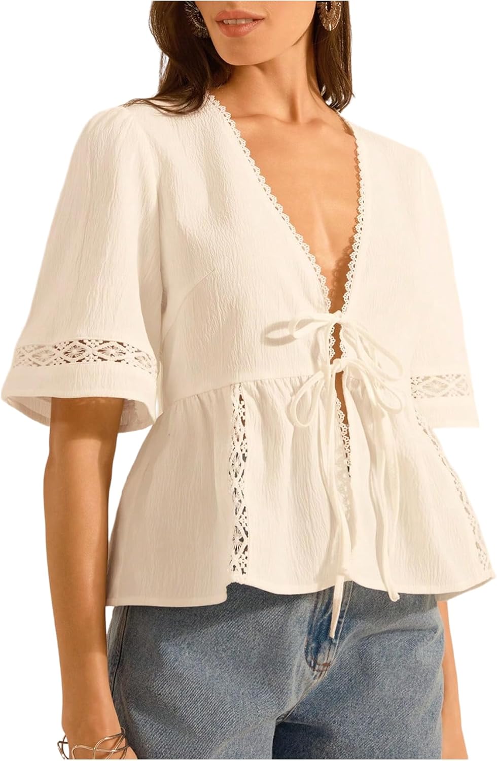 SweatyRocks Women's Half Sleeve Peplum Blouses Boho Summer Deep V Neck Ruffle Tops