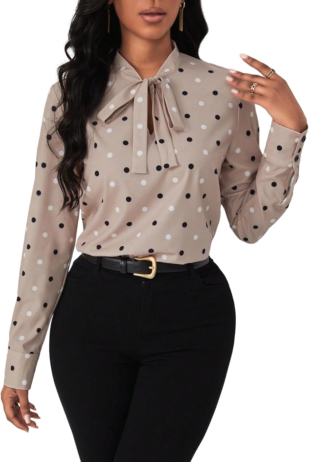 WDIRARA Women's Polka Dots Tie Front Blouse Long Sleeve Elegant Shirt Workwear Tops
