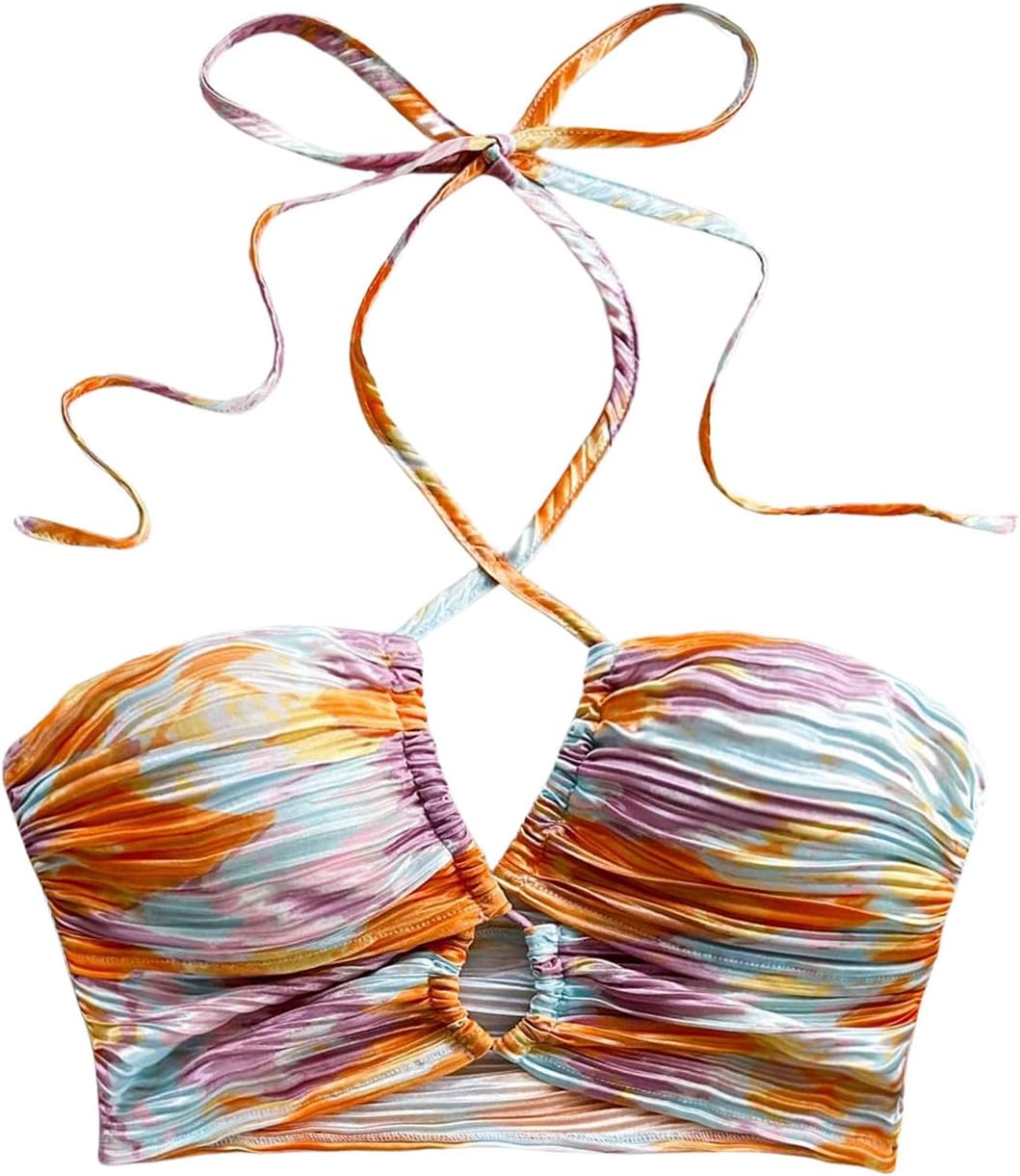 MakeMeChic Women's Floral Tie Dye Halter Top Ruched Criss Cross Cut Out Boho Crop Tops