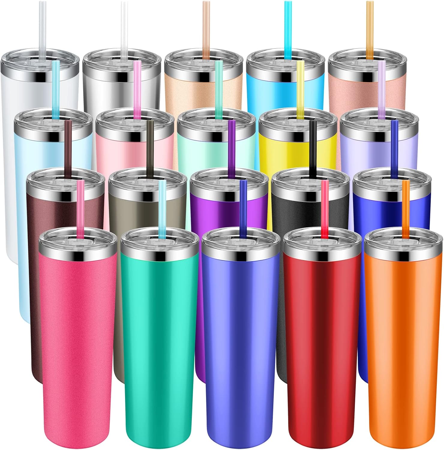 Thenshop 20 Pack Skinny Tumblers with Lids and Straws 20 oz Stainless Steel Tumbler Bulk Double Wall Vacuum Insulated Travel Cup Skinny Coffee Mug for Coffee Water Hot Cold Drinks