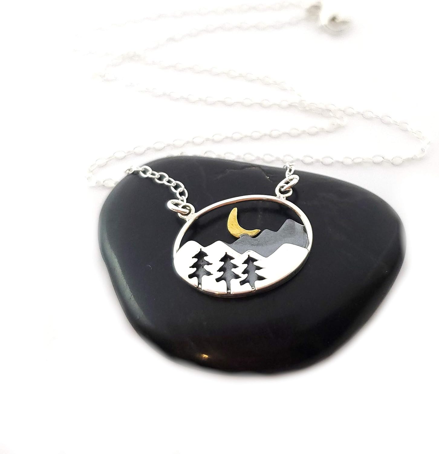 Sterling Silver Mountain Necklace – Handmade Nature Jewelry with Crescent Moon, Outdoor Adventure Gift