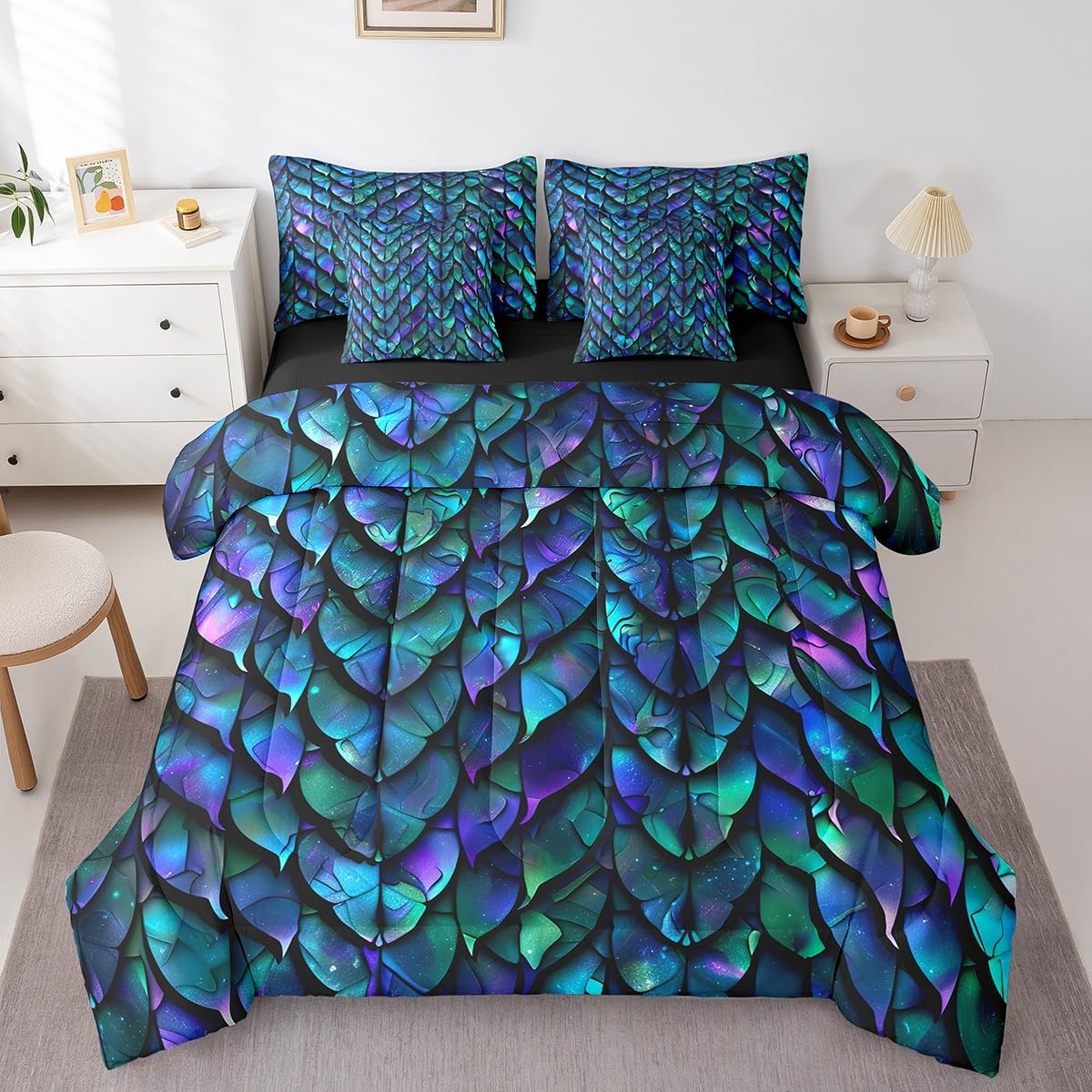 Erosebridal Dragon Scale Queen Comforter Set 7 Pieces Reversible Comforters Bed Set Bed in a Bag with Comforter,Wild Animal Skin Sheets,Pillowcases & Shams,Psychedelic Animal Hide Bedding Sets