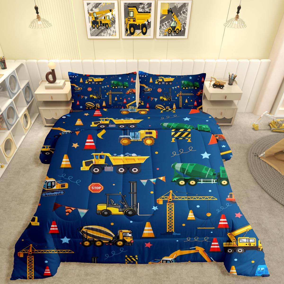 jejeloiu Trucks Excavator Cars Comforter Set Twin Size Construction Vehicles Bedding Set for Kids Boys Girls Cartoon Equipment Trucks Duvet Quilt Blue Yellow Bedroom 2 Pcs with 1 Pillow Cases