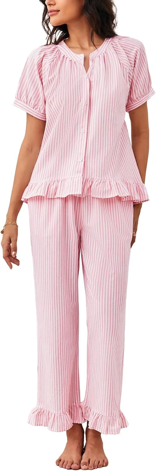 Flygo Womens Striped Pajama Sets 2 Piece Cotton Pjs Lounge Set Ruffle Button Down Tops Long Pants Soft Sleepwear with Pockets