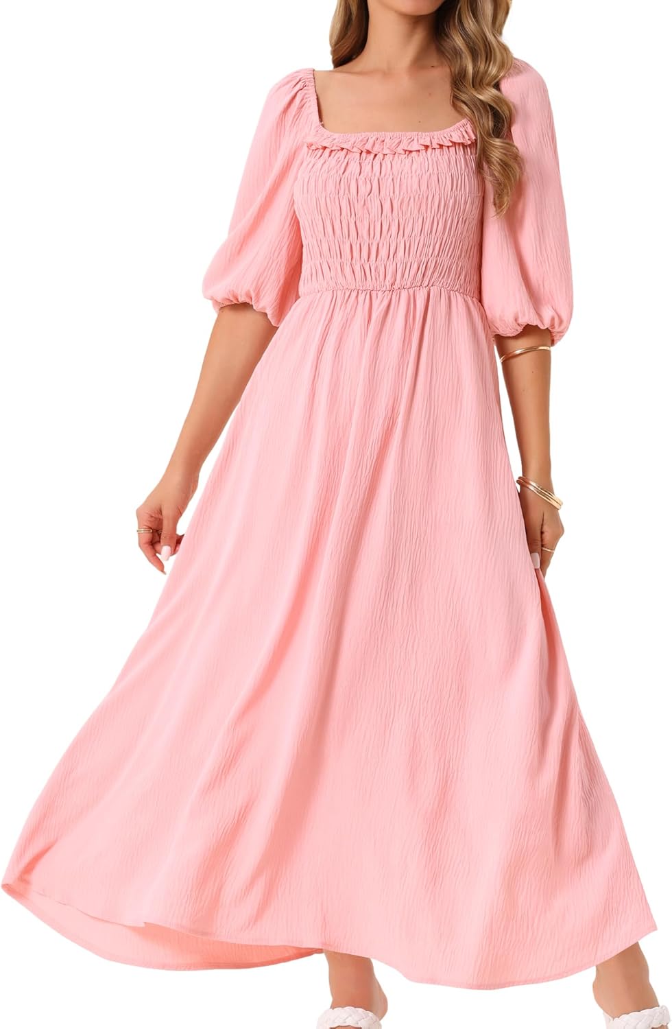 Seta T Women's Summer Dresses Casual Puff Half Sleeve Square Neck Smocked Flowy Maxi Dress with Pockets