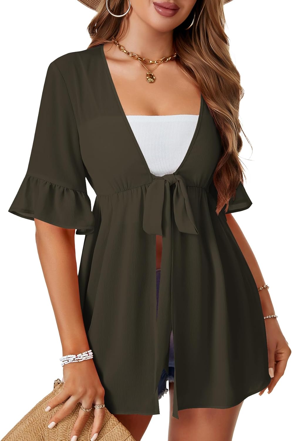 LYANER Women's V Neck Flounce Half Sleeve Tie Knot Front Coverup Beach Cardigan Blouse