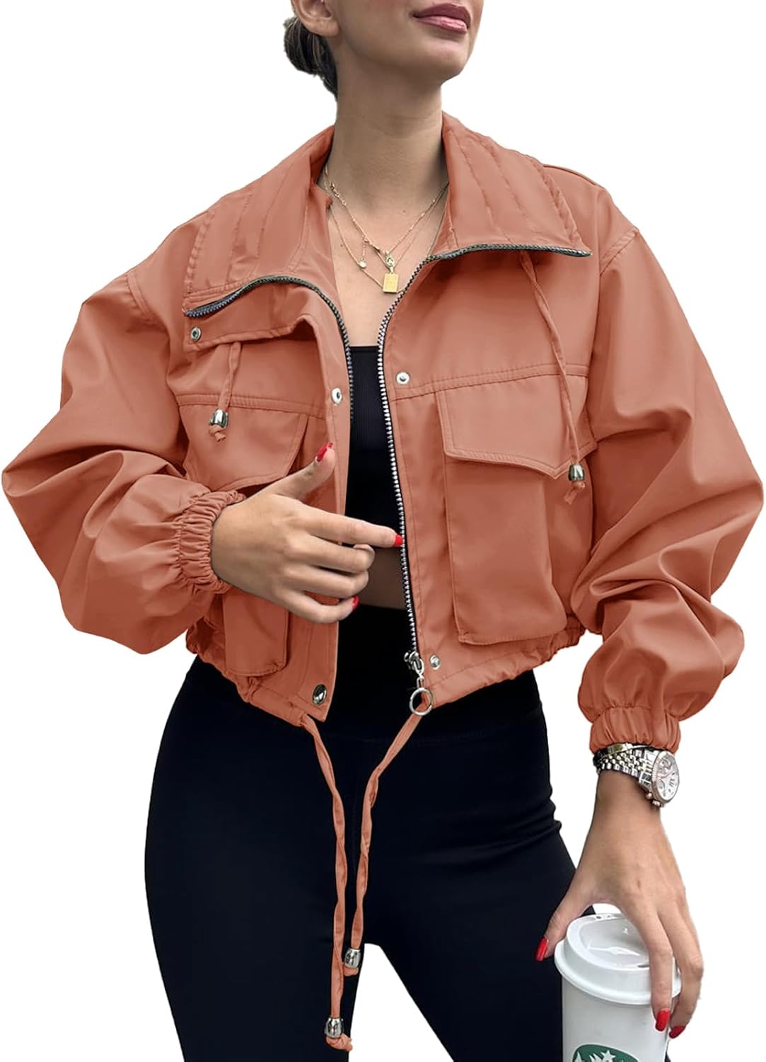 Tankaneo Womens Cropped Jacket Zip Up Lightweight Oversized Utility Anorak Coat with Pockets