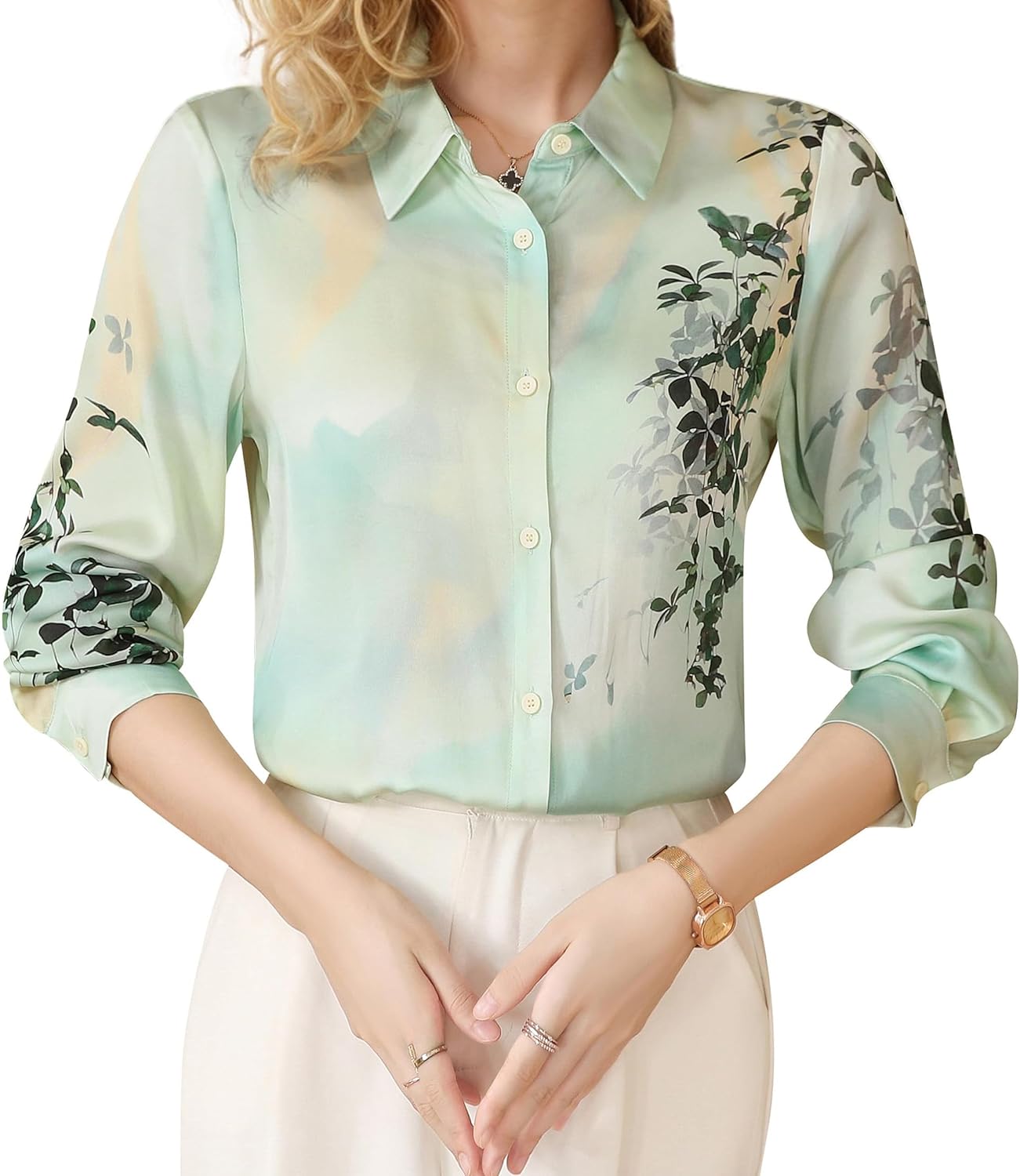 LAI MENG FIVE CATS Women's Silk Satin Shirt Floral Print Long Sleeve Button Down Casual Blouse Top