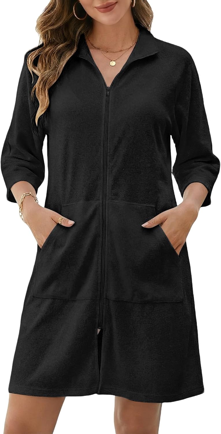 Bsubseach Swimsuit Coverup for Women Terry Cloth Swim Cover Up Zipper 3/4 Sleeves Beach Cover Ups Bathrobe with Pockets