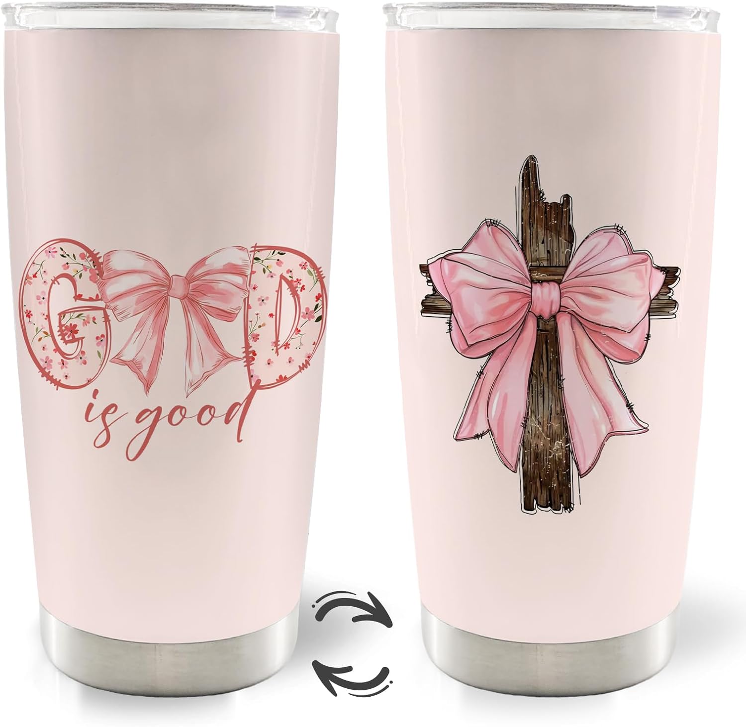 Christian God is Good Pink Bow Cross 20oz Travel Coffee Mug Tumbler, Christian Easter Tumbler Gifts for Women Kids, Preppy Stuff, Pink Preppy Water Stainless Steel Tumbler with Lid and Straw