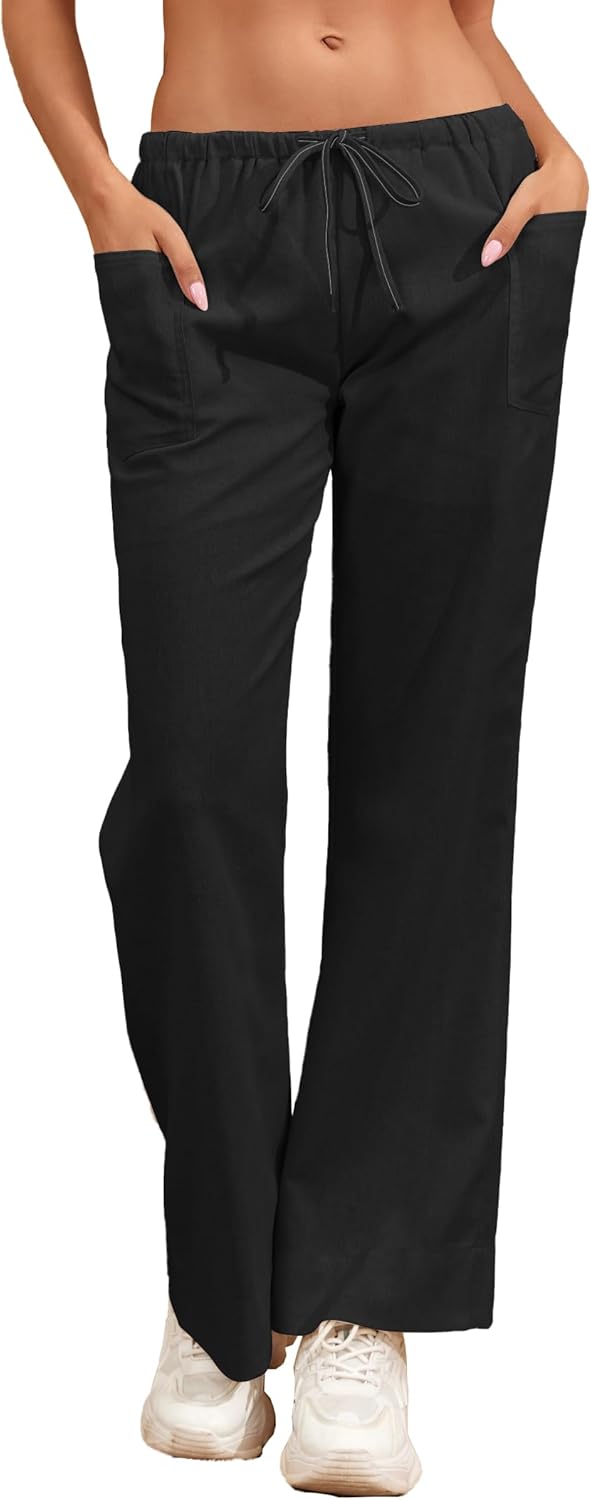 Famulily Womens Linen Pants Summer Wide Leg Casual Loose Drawstring Low Waist Palazzo Pants Lined Trousers with Patch Pockets
