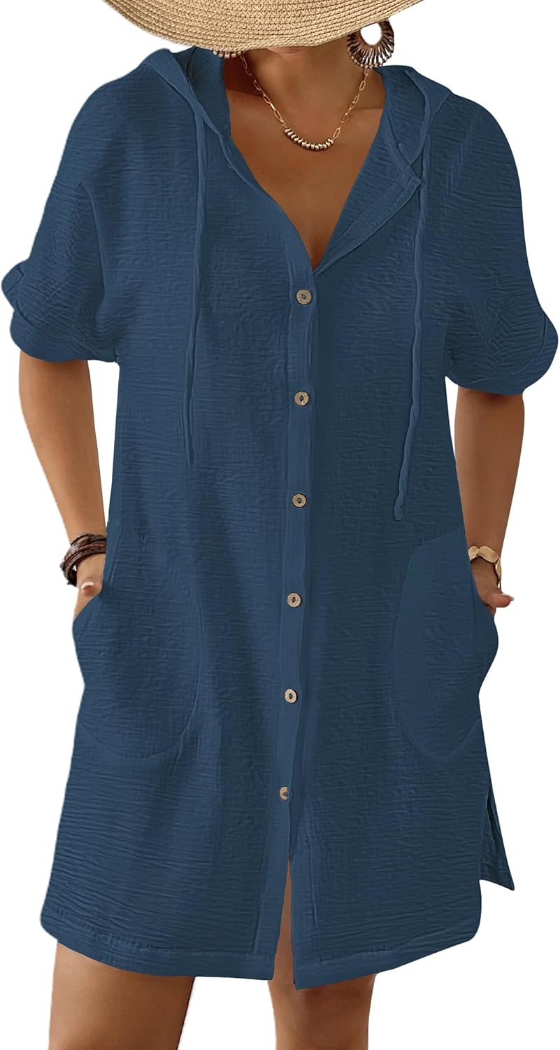 Bsubseach Womens Swimsuit Cover Up Shirt Button Down Short Sleeve Bathingsuit Coverups Hooded Beach Coverup With Pockets