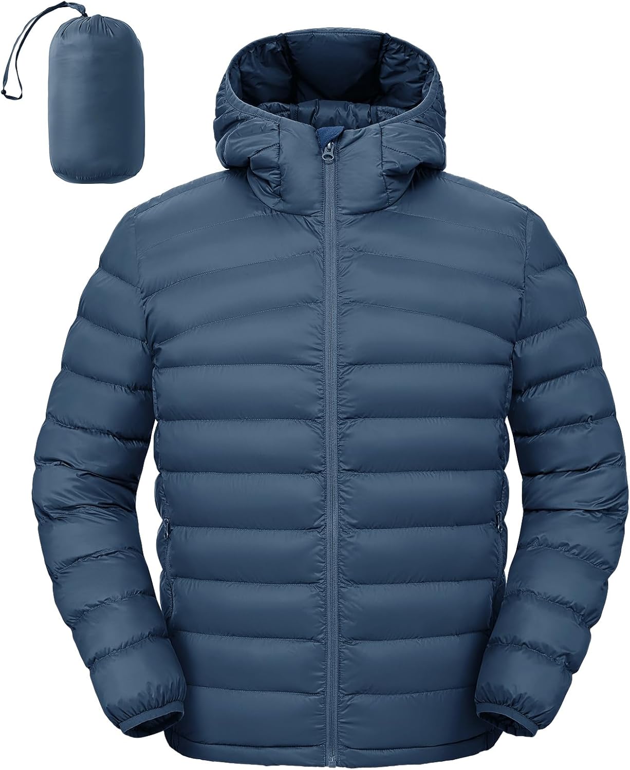 Rdruko Men's Puffer Jacket with Hood Packable Lightweight High Collar Puffy Winter Coat for Hiking Travel,Dark Blue,L