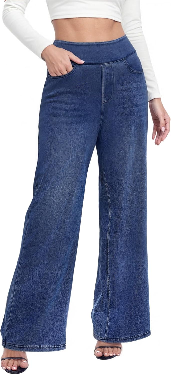 Wide Leg Pull On Jeans Womens High Rise Stretchy Jeans Denim Pants with Elastic Waist Tummy Control Straight Leg Pant
