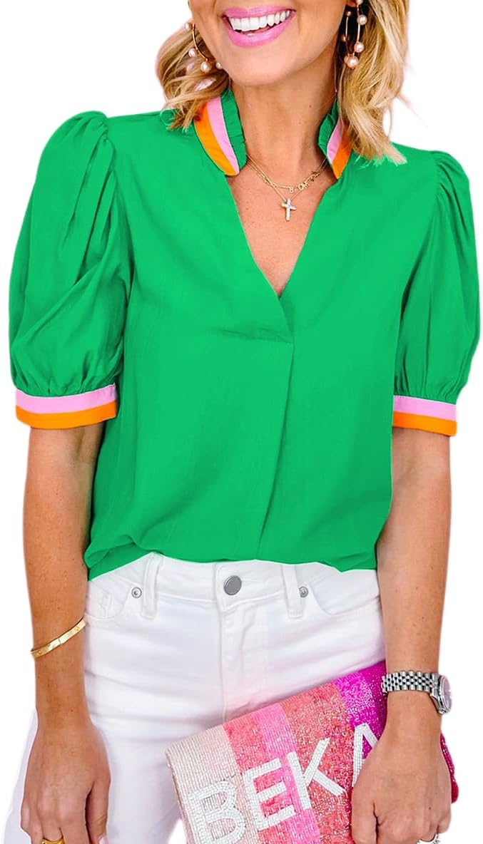 Chvity Womens Colorful Striped Trim Colorblock Tunic Tops V Neck Puff Sleeve Casual Loose Summer Blouse Shirts