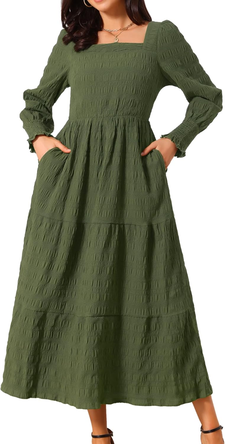 Seta T Women's Long Dress Long Sleeve Square Neck Flowy Tiered Fall Casual Maxi Dresses with Pockets