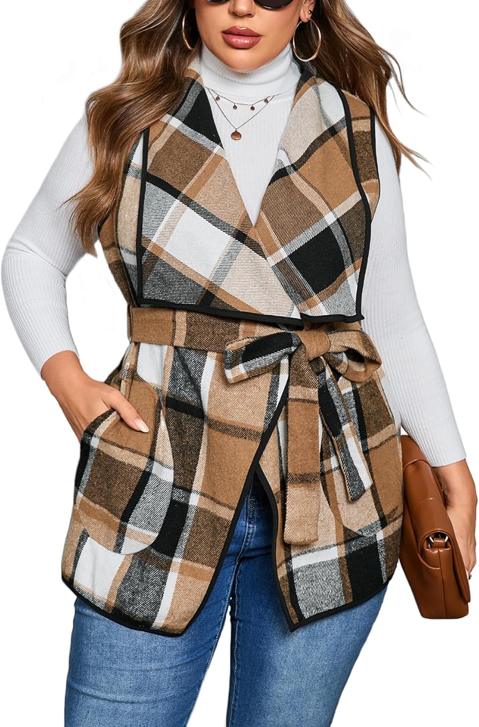 ZOMVA Women's Plus Size Plaid Long Vest Lapel Open Front Belted Sleeveless Shacket Casual Jackets Coat with Pockets Fall