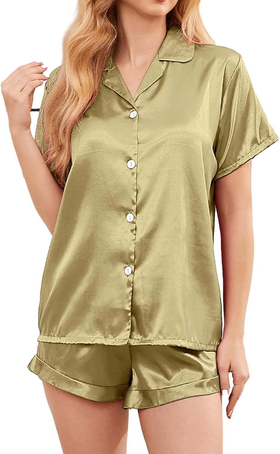 Women's Comfy Satin Pajamas - Soft Button-Up Shirt & Ruffled Adjustable Drawstring Shorts - Elegant Sliky Pjs