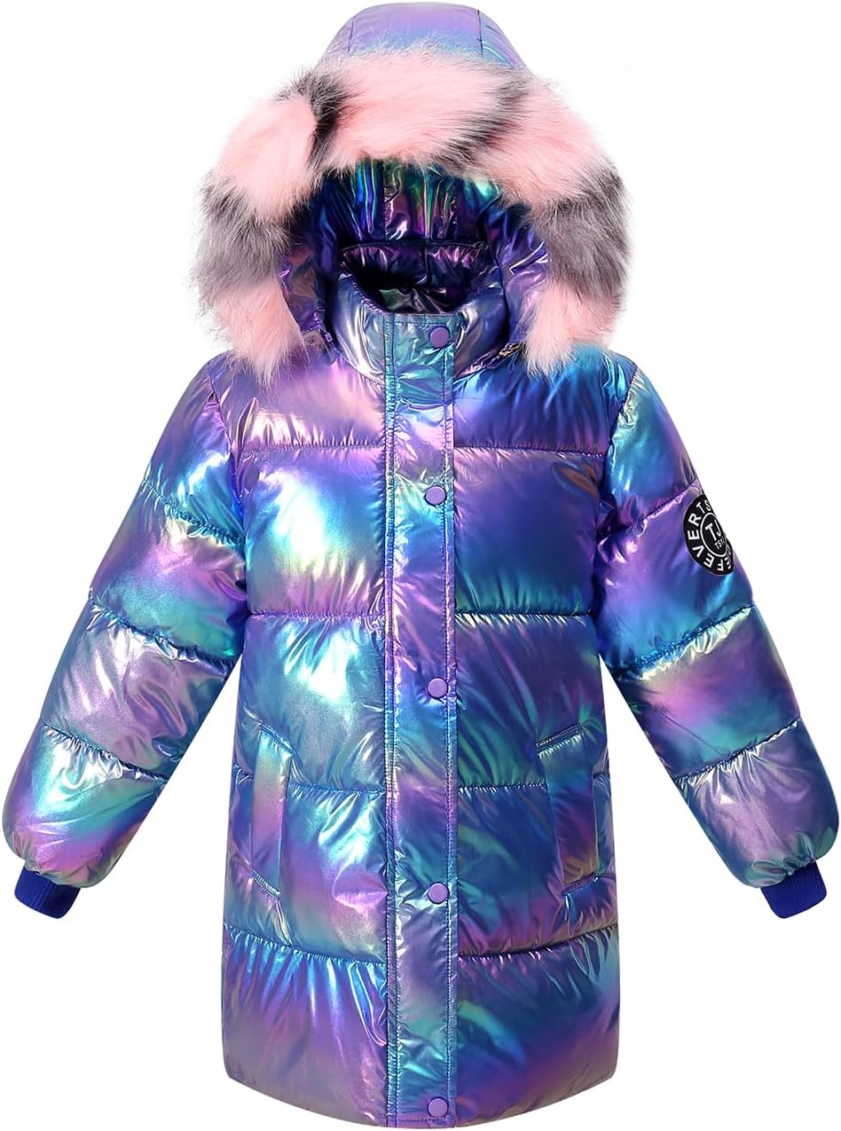 Girl Waterproof Long Coat Winter Puffer Jacket Kid Metallic Shiny Hooded Clothes