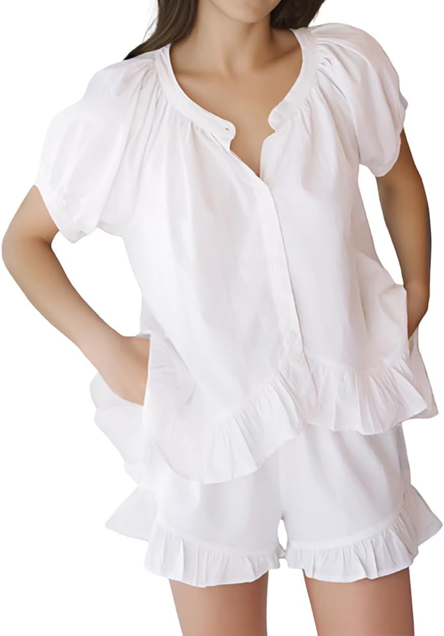 Womens Fashion Summer Short Sets Short Sleeve Button Down Ruffle Trim Top and Shorts Cotton Pajama Sets