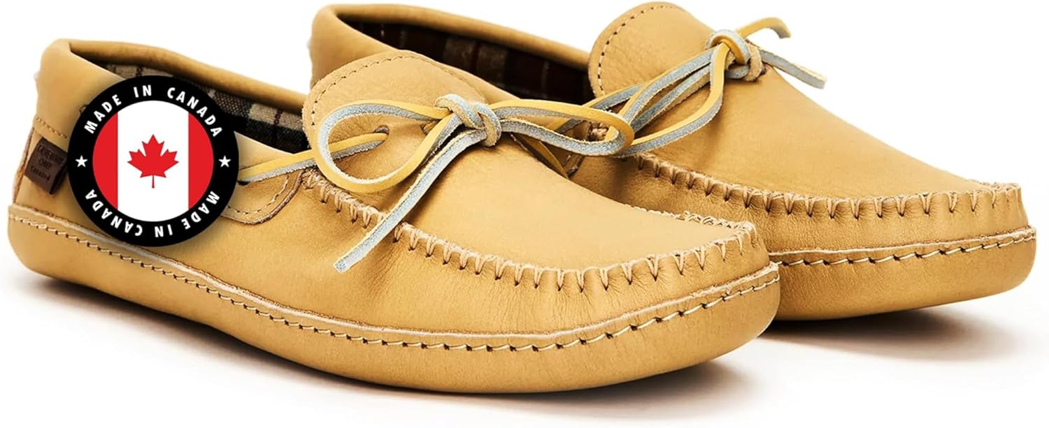 Laurentian Chief Leather Moccasins for Men – Stylish Mens Moccasin Slippers with Plaid Insole Lining, Comfortable Indoor Shoes, Single Lacing, Durable Leather Sole, Made in Canada
