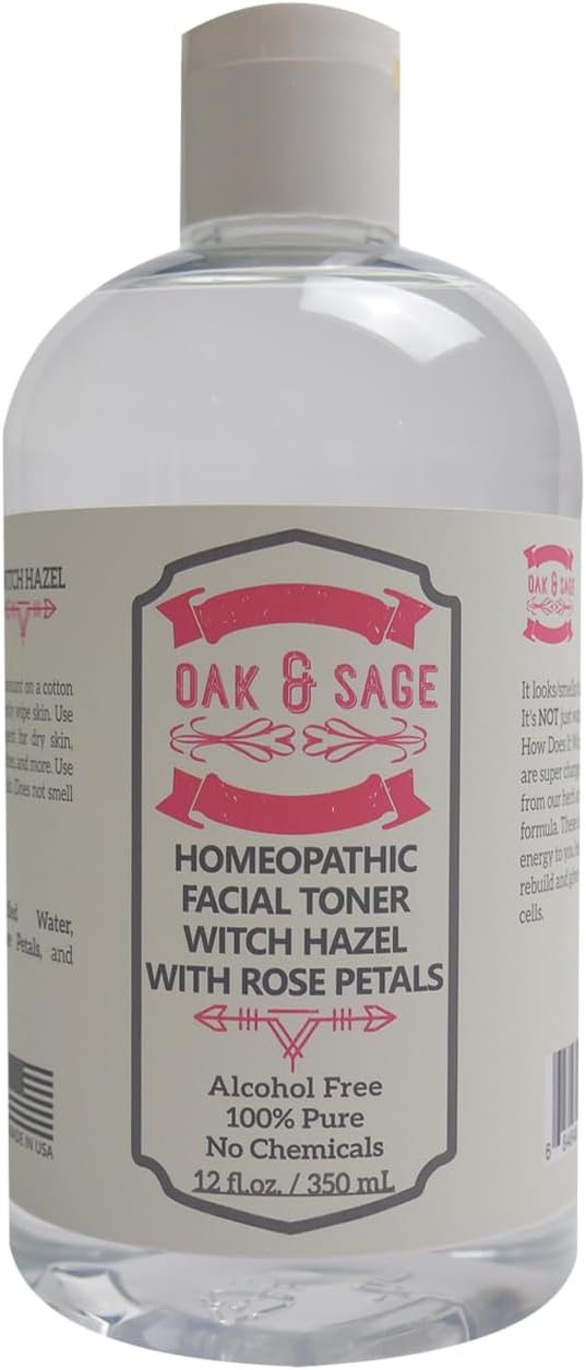 Oak & Sage Homeopathic Facial Toner Witch Hazel with Rose Petals - Unscented - 12oz Astringent, 100% Pure, No Alcohol, No Additives