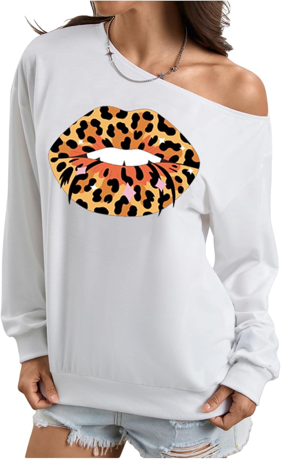 SweatyRocks Women's Off The Shoulder Tops Leopard Lip Sweatshirts Long Sleeve Casual Trendy Fall Pullover Top