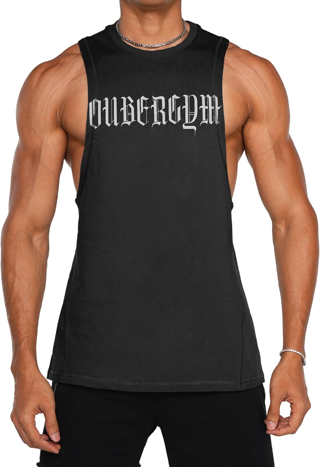 Ouber Men's Drop Arm Tank Top Cotton Sleeveless Gym Bodybuilding Shirt Black,S