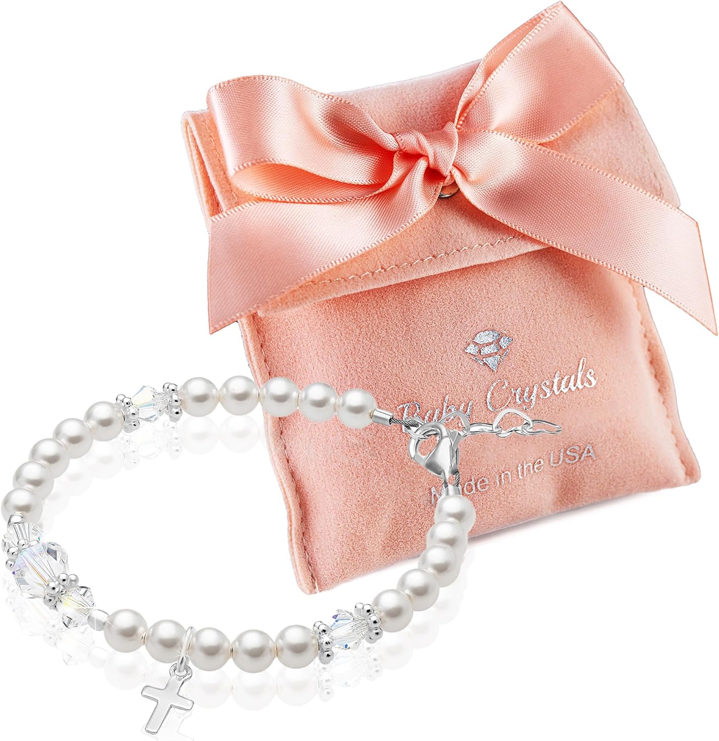 Baby Crystals Pearl Bracelets for Girls, Sterling Silver Cross Charm, Baptism Gifts for Girl, Baby Bracelet with Simulated White Pearls and Crystals, Girls Jewelry Birthday Gift