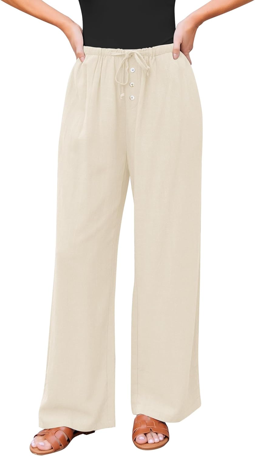 GRAPENT Linen Wide Leg Pants Woman High Waisted Pull On Button Drawstring Baggy Casual Summer Palazzo Pants with Pockets
