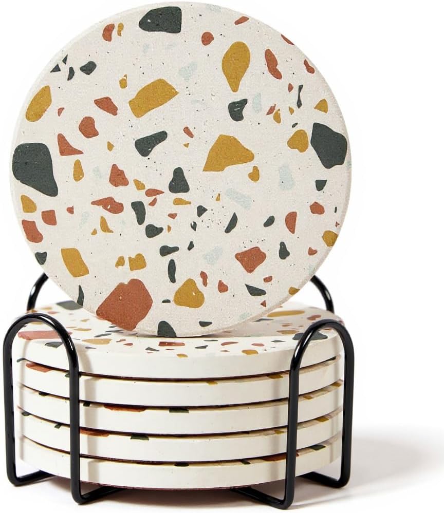 - Modern Terrazzo Design with Marble Coasters Look - Crafted with a terrazzo style and marble-inspired finish, this ceramic coasters set of 6 adds a decorative touch to living rooms, kitchens, patios, and offices. A great upgrade to any modern décor.