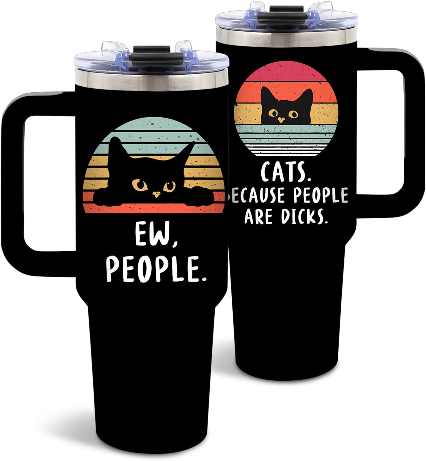 - Special Design for Cat Lovers: This DUUV 40 oz tumbler features a playful black cat and bold text saying "EW, PEOPLE" and "CATS. BECAUSE PEOPLE ARE DICKS," making it a standout choice for cat lover gifts for women who love a mix of humor and style. The retro rainbow stripes add a cheerful touch for cat gifts