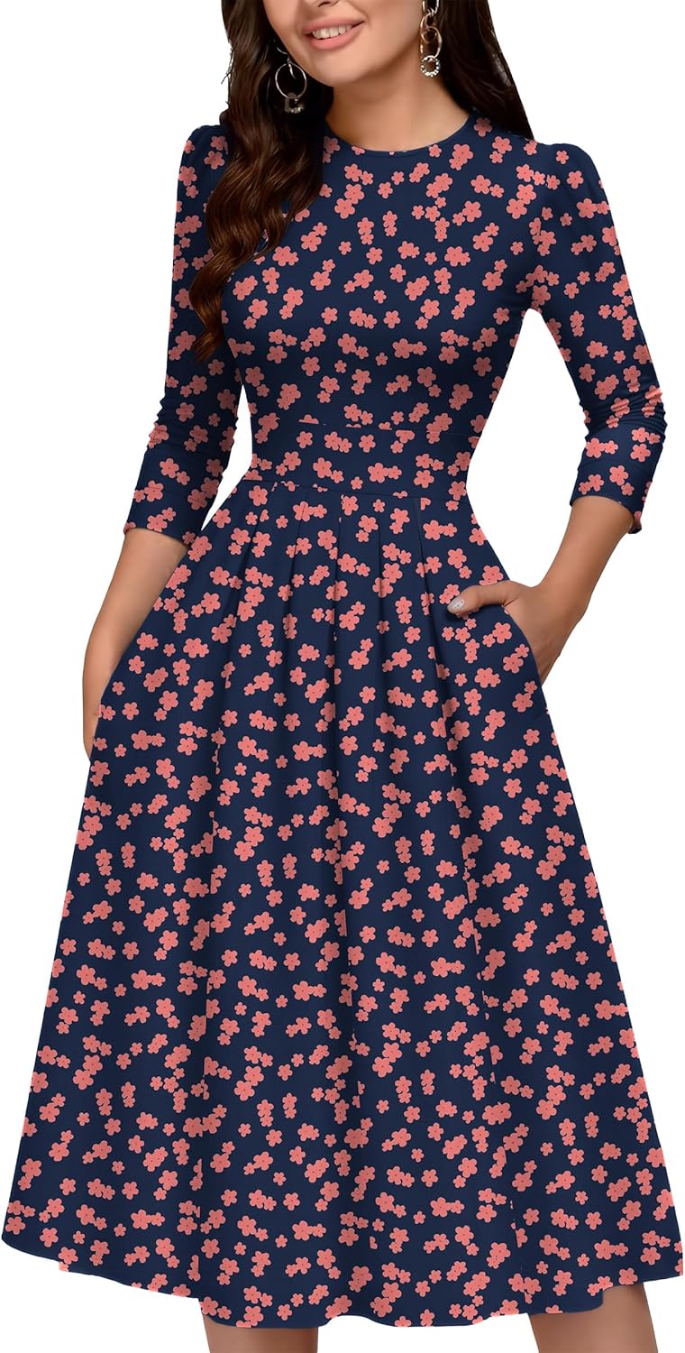 Runwind Vintage Dress for Women - 3/4 Sleeve Casual A-Line Wedding Guest Cocktail Dress with Pockets